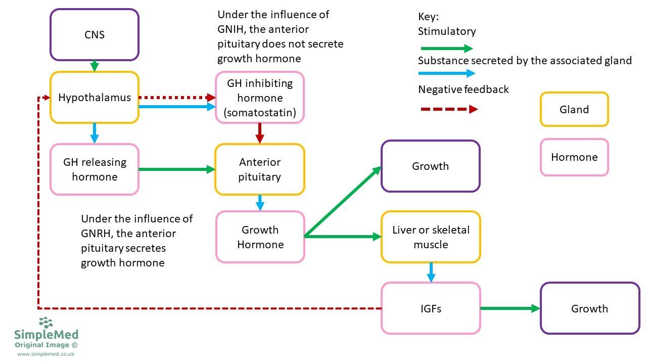 Diagram: Shows the long negative feedback loop controlling growth hormone release