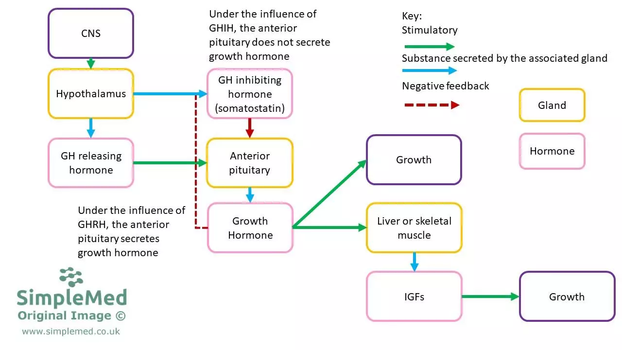 The secretion of growth hormone is regulated by growth hormone releasing hormone (GHRH) and growth hormone inhibiting hormone (GHIH or somatostatin) released from the hypothalamus. These two hormones are in turn regulated by the central nervous system, which controls secretion through inputs to the hypothalamus. It can also be regulated by short loop and long loop negative feedback.