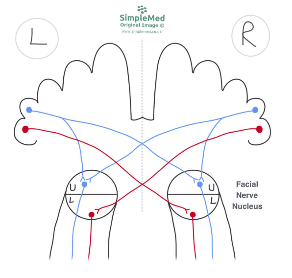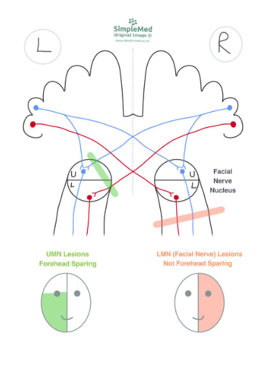 This knowledge can be used to distinguish between a facial nerve lesion (LMN) and a brain injury (UMN).