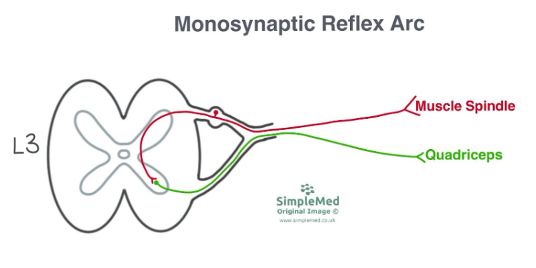 When considering the patellar reflex as a monosynaptic reflex arc, the patellar tendon is struck with a hammer, this is detected by the stretch of the muscle spindle fibres, and the quadriceps contract, straightening the leg. This is shown in the image below, with the sensory neurone shown in red and the LMN shown in green.