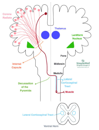 The axons of all the upper motor neurones converge down the same path, called the Corona Radiata. This is a bundle of axons that forms the white matter structure of the internal capsule as it runs between the thalamus and the lentiform nucleus. The internal capsules run at an oblique (diagonal) angle from the hemispheres of the brain to the midbrain of the brainstem.