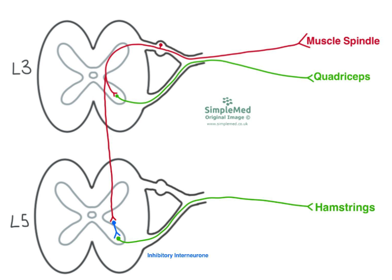 However, in reality, although the quadriceps contraction is mediated by a monosynaptic connection, effective knee extension also requires inhibition of the hamstrings. This occurs via a parallel polysynaptic pathway involving an inhibitory interneurone, a process known as reciprocal inhibition. The diagram below shows how the sensory neurone detecting the tendon hammer sends impulses to both the quadriceps and the hamstrings via lower motor neurones, but that the impulse to the hamstrings goes via an inhibitory interneurone, causing contraction of the quadriceps muscles and relaxation of the hamstrings.