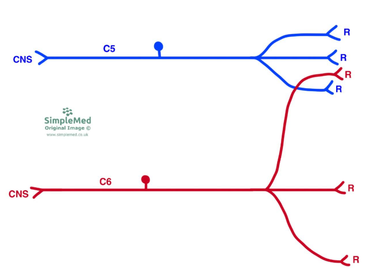 It is also important to note that there is some overlap between the receptive fields of adjacent first order sensory neurones. This means that there is some overlap between the areas of skin supplied by one spinal nerve, and therefore some overlap between adjacent dermatomes. This is why when examining dermatomes, the best practice is to test the function of each dermatome using a spot that is central to the dermatome, as this is unlikely to have overlap with a neighbouring dermatome.