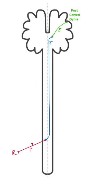 All of the somatosensory system follows three laws: first order neurones have their cell bodies in the dorsal root ganglion and project ipsilaterally; second order neurones have their cell bodies in the dorsal horn or medulla and decussate (cross the midline); third order neurones have their cell bodies in the thalamus and project to the primary sensory cortex.