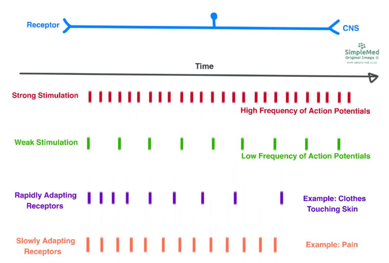 Some rapidly adapting receptors, including certain mechanoreceptors, respond best to changes in signal strength. However, these receptors are rapidly adapting, meaning their frequency of firing decreases with extended stimuli, to help prevent ‘normal’ sensations (like clothes on the skin) from becoming overwhelming.