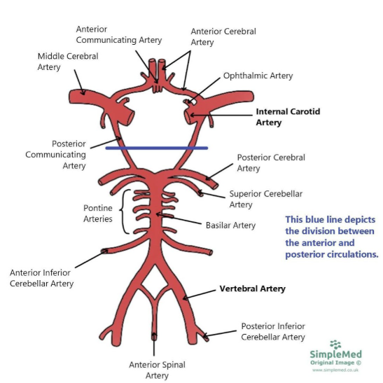 The blood supply to the brain comes from two main sources, the internal carotid artery and the vertebral arteries, which come together to form the Circle of Willis. The Circle of Willis has three main terminal branches (the anterior cerebral artery, the middle cerebral artery, and the posterior cerebral artery), which create three main arterial territories. The blood supply to the brain is also divided into the anterior and posterior circulations, an artificial divide through the posterior communicating artery, as shown on the diagram below.