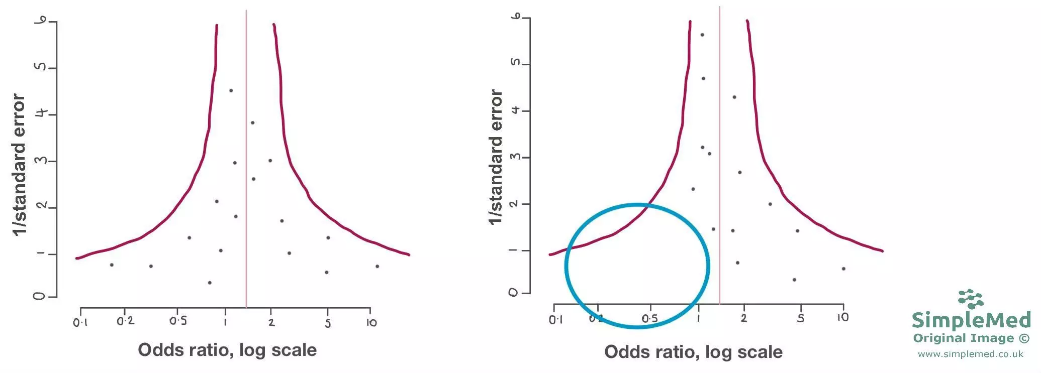 Diagram showing two funnel plots, the left side being more symmetrical and the right showing asymmetry. If a funnel plot is broadly symmetrical, this suggests there is no clear evidence of publication bias or other small-study effects, but it does not exclude them. If a funnel plot shows gaps or asymmetry (as shown by the blue circle), this may indicate publication bias, particularly where smaller studies with unfavourable results are missing, although other explanations such as heterogeneity or chance should also be considered.